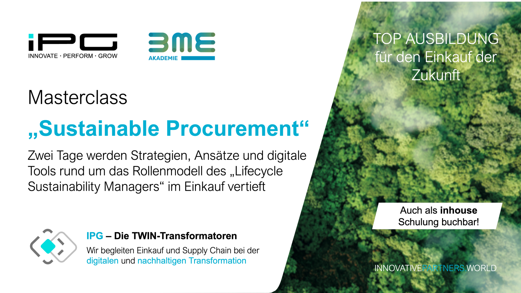 Nehmen Sie an der nächsten Masterclass „Sustainable Procurement“ der BME Akademie GmbH unter der Leitung von IPG teil.