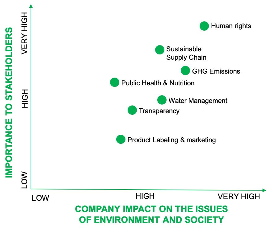 These topics are usually scattered on the matrix with importance to the stakeholders as vertical index and importance to the ESG commitment of the company index on its horizontal side.