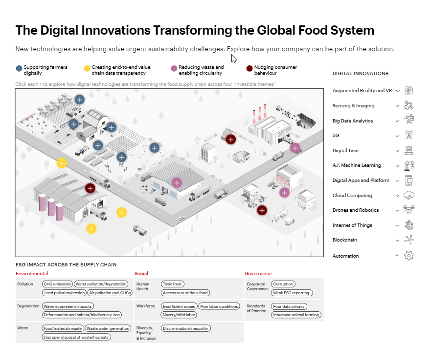 Bain & Company and the World Economic Forum (WEF), while building on earlier research into the impact of digital on food sustainability in nine different industries, researched areas of innovation capable of increasing the pace of change and jump-starting collaboration. Four “investible themes” emerged. Each addresses important environmental, social and governance (ESG) externalities the food industry faces while also having the potential to earn an attractive return on time, energy and money invested. All require collective action and a collaborative approach in order to scale.