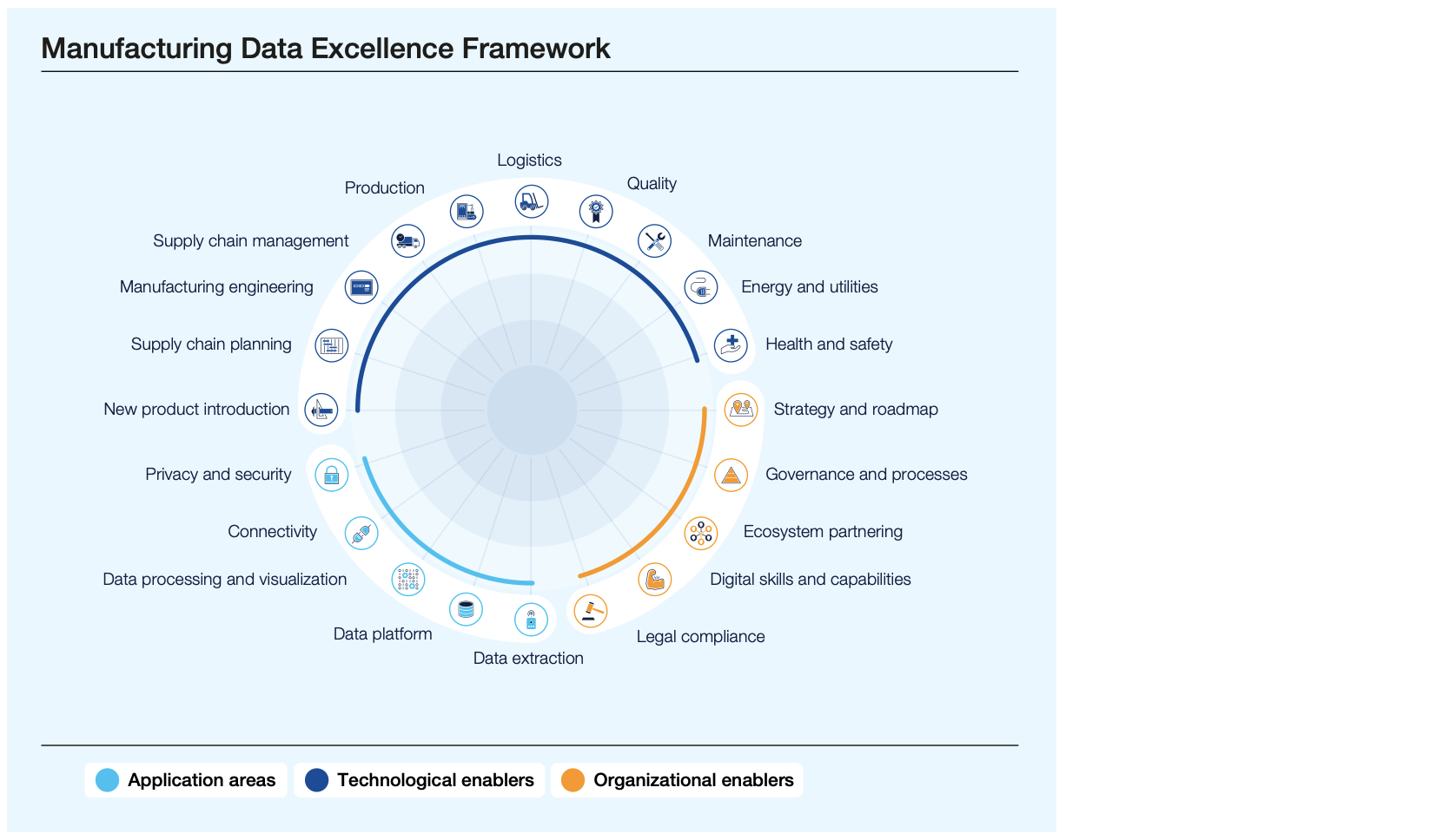 To accelerate the development of globally connected manufacturing data ecosystems, the Forum and its community have developed a Manufacturing Data Excellence Framework. The framework helps companies develop new capabilities, build new partnerships and evaluate the maturity of their data-driven applications. They can also use it to assess their progress in establishing the organizational and technological enablers required to extract value from data at a company, supply chain and ecosystem level.